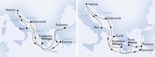 La segunda opción viene a bordo del MSC Musica con un itinerario de 8 días – 7 noches que parte igualmente de Venecia y visita los puertos de Bari, Katakolon, Santorini, Mykonos, Pireo, Corfú, Dubrovnik y retorna a Venecia. Las fechas de salidas son diversas, en julio (23), agosto (27), Septiembre (3, 24) y octubre (1 y 8). Los precios de esta oferta comienzan desde 700 € si piensa viajar en octubre 2012.