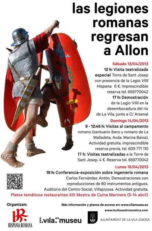 Esta actitud nos la demuestran estos días en Allon, Villajoyosa, en la provincia de Alicante, la Legio VIIII Hispana, quienes durante los días 13, 14 y 15 de abril de 2013 nos ofrecen una serie de actividades de Recreación Histórica que nos compensarán con creces durante este próximo fin de semana. Entre sus actividades encontraremos visitas teatralizadas, demostraciones guerreras, visitas al campamento romano, conferencias sobre ingeniería romana, además de poder deleitarnos con una cocina adaptada a la época que sin duda nos sorprenderá también.